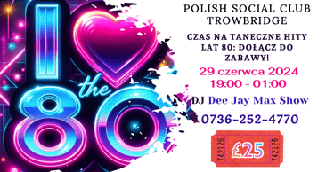 Zapraszamy na imprezę taneczną w stylu lat 80, która odbędzie się w Polish Social Club Trowbridge 29 czerwca 2024 roku!